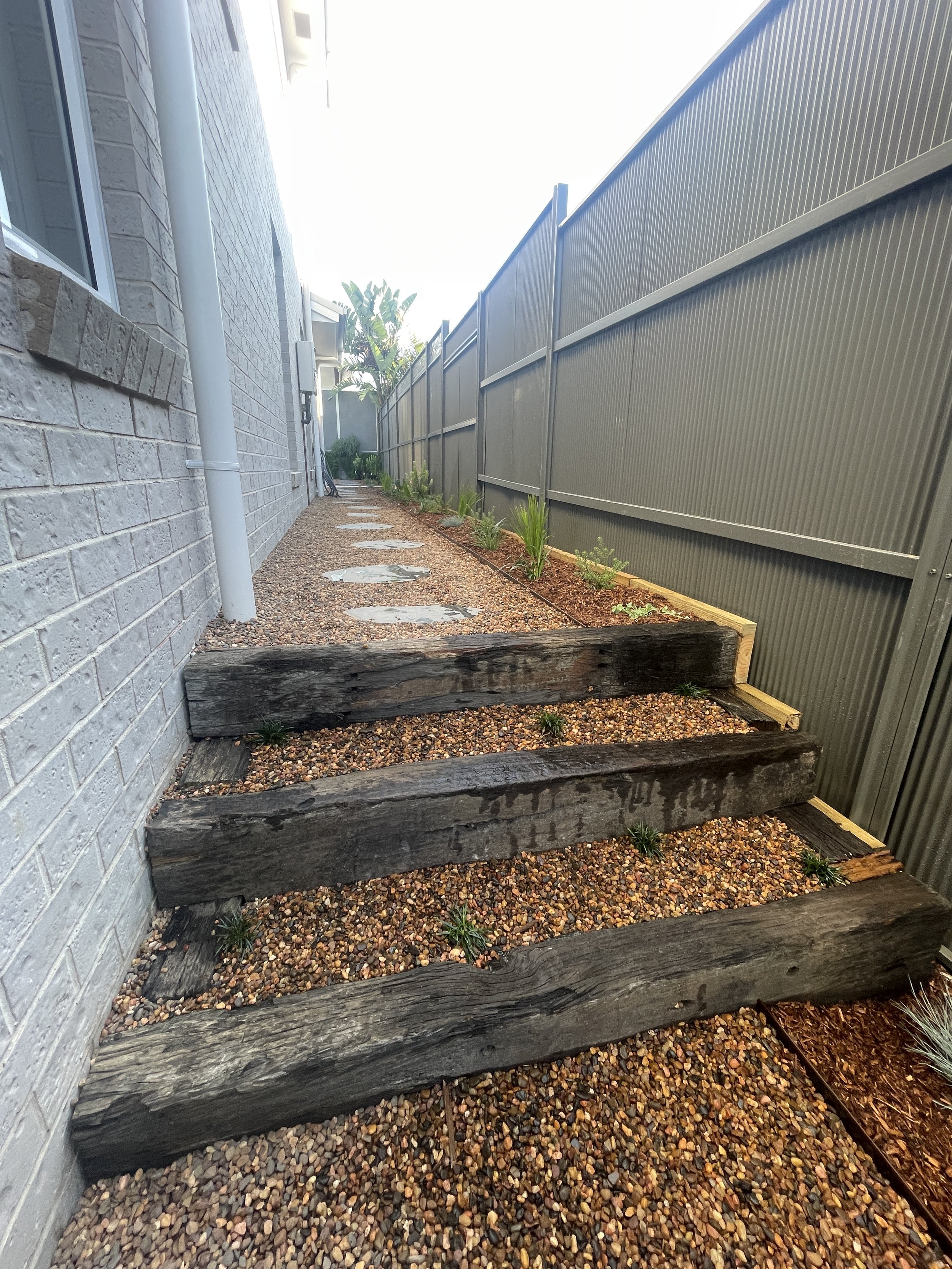 The works included timber retaining walls with integrated subsoil drainage, AS-compliant stairs to improve access, and a curated selection of Australian native plantings chosen for slope stabilisation and low maintenance. An automated Rain Bird irrigation system supports long-term plant health.